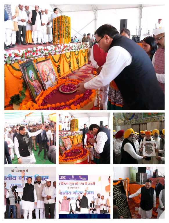 कार्यक्रम में सम्बोधित करते हुए मुख्यमंत्री पुष्कर सिंह धामी ने भगवान बिरसा मुण्डा की 150 वीं जयंती पर उन्हें नमन करते हुए सभी को जनजाति गौरव दिवस की बधाई। उन्होंने कहा कि यह कि यह मेरे लिए अत्यंत हर्ष व गौरव का विषय है कि मुझे आज जनजाति गौरव दिवस के अवसर पर नानकमत्ता क्षेत्र के सभी परिवारजनों बीच में उपस्थित होने का अवसर मिला है। आज का यह ऐतिहासिक दिन हमारे जनजाति समाज की गौरवशाली परम्परा, संघर्ष, बलिदान और राष्ट्र निर्माण के लिए उनके द्वारा दिए गए अद्वितीय योगदान को स्मरण करने का दिवस है। उन्होंने कहा कि धरती आबा भगवान बिरसा मुण्डा जी जनजाति समाज के गौरव, साहस और स्वाभिमान के अमर प्रतीक है। जिन्होंने अपने जीवन काल में वो अद्भुत कार्य करके दिखाया जो हमारी आने वाली पीढ़ियों एवं समाज को प्रेरित करने का काम करेंगे। उन्होंने कहा कि भगवान बिरसा मुण्डा ने अल्प आयु में स्वतंत्रता, स्वाधिकार आत्मसम्मान की ऐसी चेतना समाज में जागृत की जिसने पूरे जनजाति समाज को एकजुट कर नई दिशा प्रदान की। उन्होंने कहा की भगवान श्री बिरसा मुण्डा ने जनजाति समाज में व्याप्त कुरीतियों के जागरूकता फैला कर जनजाति समाज को संगठित करने का काम किया। भारत का प्रत्येक नागरिक बिरसा मुण्डा को महामानव के रूप में याद करेगा।