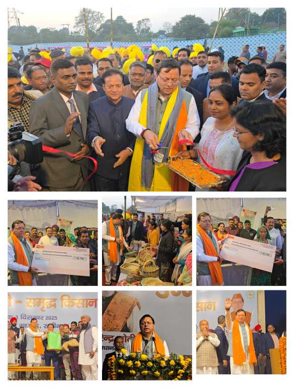 प्रदर्शनी में पंतनगर विश्वविद्यालय, कृषि विभाग के साथ ही अन्य विभागों के द्वारा लगाए गए स्टॉलों से सीमांत क्षेत्रों किसानों को उन्नत कृषि करने एवं उनको लाभान्वित करने के लिए आयोजित किये गए है। कार्यक्रम में मुख्यमंत्री धामी द्वारा रीप परियोजना के अंतर्गत स्वयं सहायता समूह की महिलाओ को छः ई रिक्शा, कृषि विभाग के दो प्रगतिशील किसानों को रूपये 49,750/- के अनुदान चेक, एक हजार किसानों को कृषक किट के सापेक्ष सांकेतिक रूप से पांच किसानों को किट वितरित किये गए। उन्होंने कहा कि किसान व सरकार मिलकर उत्तराखंड को देश का सर्वश्रेष्ठ राज्य बनायेंगे।