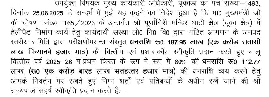 हेलीपैड निर्माण हेतु इस चालू वित्तीय वर्ष 2025-26 में प्रथम किस्त के रूप में 60% अर्थात ₹112.77 लाख (रू० एक करोड़ बारह लाख सतहत्तर हजार मात्र) जारी करने की अनुमति दी गई है।