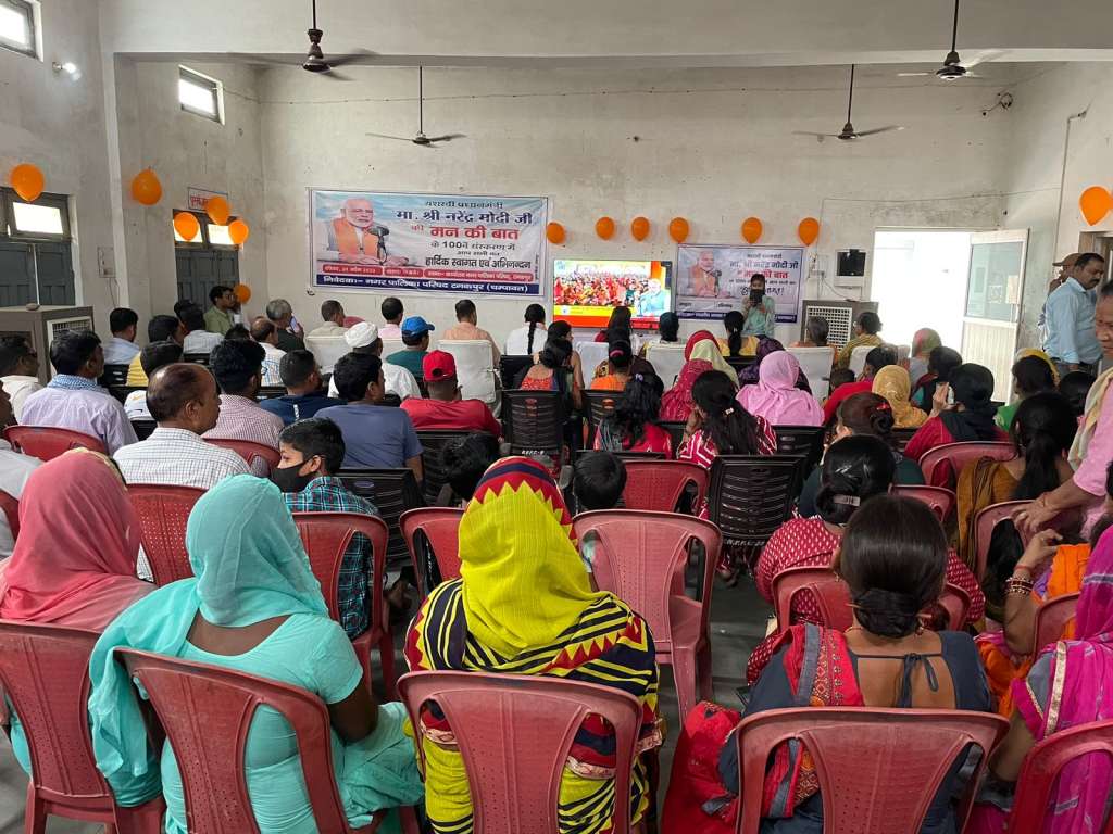 टनकपुर(चंपावत)- देश के प्रधानमंत्री नरेंद्र मोदी के “मन की बात कार्यक्रम” के 100 संस्करण के प्रसारण को रविवार को प्रातः 11 बजे नगर पालिका सामुदायिक हाल में नगर पालिका द्वारा आयोजित किया गया।कार्यक्रम में टनकपुर के बूथ संख्या 134, 135, 138, 139, 140, के माध्यम से नगर क्षेत्र के सम्मानित वरिष्ठ जनों द्वारा बडे टेलीबिजन पर पीएम मोदी के मन की बात कार्यक्रम को देखा व सुना गया।